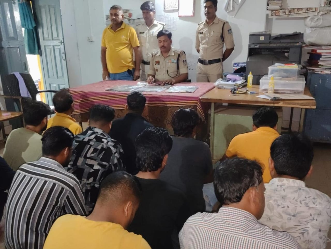 जुए के अड्डे पर छापा: पकड़े गए 14 जुआरी,35 लाख से अधिक की संपत्ति जप्त, 1.10 लाख नकद और आठ वाहन बरामद