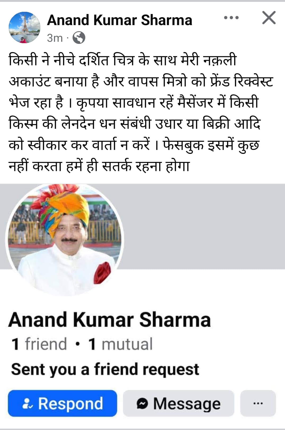 आनंद कुमार शर्मा जी ने सभी से अपील की है कि किसी भी संदिग्ध रिक्वेस्ट या मैसेज पर तुरंत सतर्क हो जाएं, और किसी भी तरह की आर्थिक जानकारी या लेनदेन से बचें।