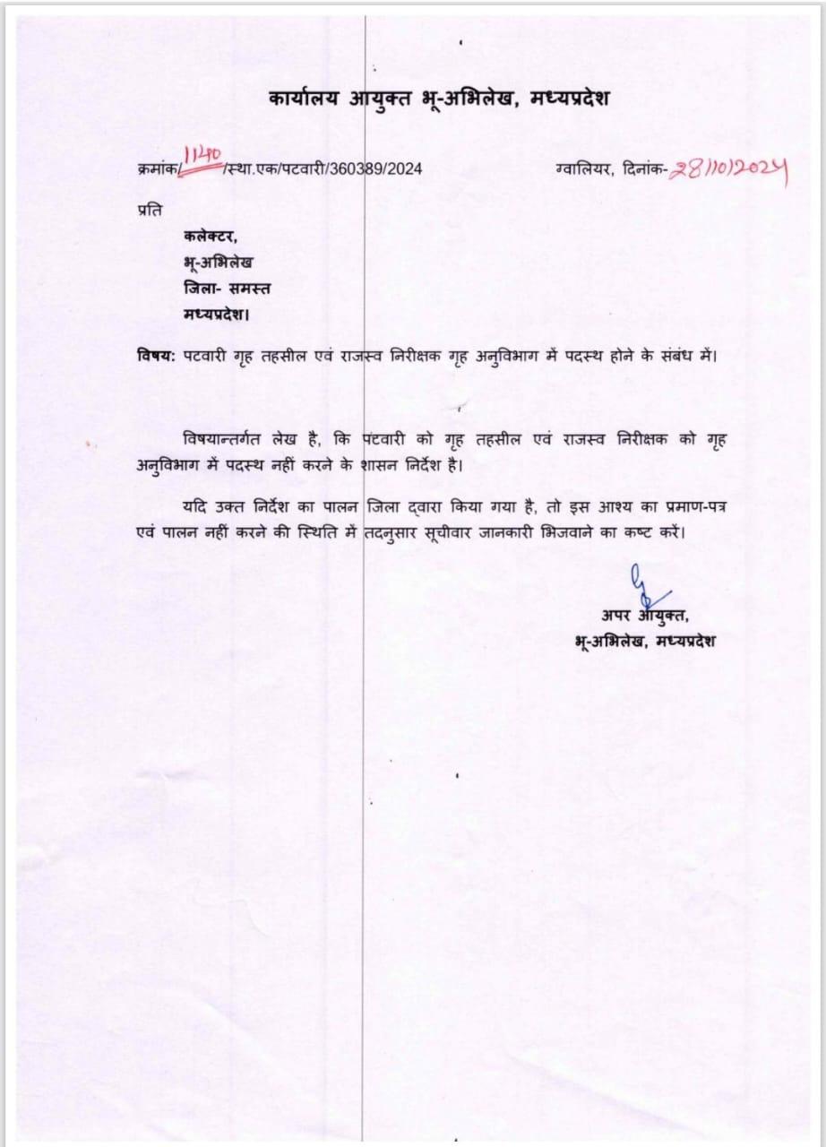 कार्यालय आयुक्त भूअभिलेख ग्वालियर ने 28 अक्टूबर 2024 को एक आदेश जारी किया था। जिसमें मध्य प्रदेश के सभी जिला प्रशासन को कहा गया था कि गृह तहसील एवं राजस्व निरीक्षक को गृह अनुविभाग में पदस्थ नहीं करने के निर्देश दिए गए थे। कहा गया था कि यदि इसका पालन किया गया तो इस आशय का प्रमाण पत्र एवं पालन नहीं करने की स्थिति में सूचीवार जानकारी भिजवाने का कष्ट करें।