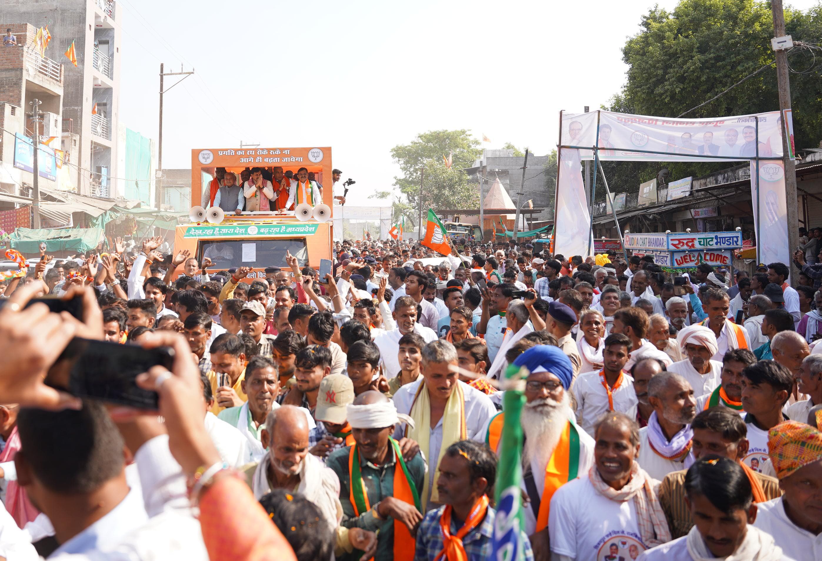 विजयपुरा में गांधी अस्पताल से तहसील कार्यालय तक निकाले गए दो किलोमीटर लंबे रोड शो में जलसैलाब उमड़ पड़ा। रोड शो में मुख्यमंत्री डॉ. मोहन यादव, भाजपा प्रदेश अध्यक्ष व सांसद श्री विष्णुदत्त शर्मा, विधानसभा अध्यक्ष श्री नरेन्द्र सिंह तोमर और पाटी प्रत्याशी श्री विजय रावत ने जनता से आशीर्वाद मांगा। रोड शो के दौरान सड़क के दोनों तरफ उपस्थित जनसमुदाय ने पुष्पवर्षा कर रोड शो का स्वागत किया। हजारों की भीड़ रो शो के दौरान रथ से आगे चल रही थी और भाजपा जिंदाबाद के नारे गूंज रहे थे।