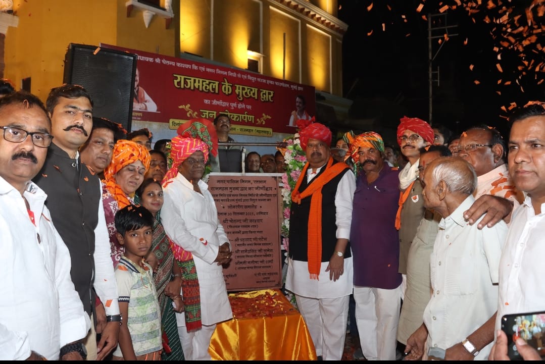 Ratlam : शहर की ऐतिहासिक धरोहर राजमहल के मुख्य द्वार का जीर्णोद्धार होने के बाद शनिवार रात विधायक चेतन्य काश्यप और महापौर प्रहलाद पटेल ने गणमान्य जनों की उपस्थिति में समारोह पूर्वक लोकार्पण किया। इस अवसर पर भव्य आतिशबाजी हुई और राजमहल का मुख्य द्वार रोशनी से जगमगा उठा। द्वार पर आर्कषक विद्युत सज्जा का कार्य इप्का फाउंडेशन मुंबई द्वारा किया गया।