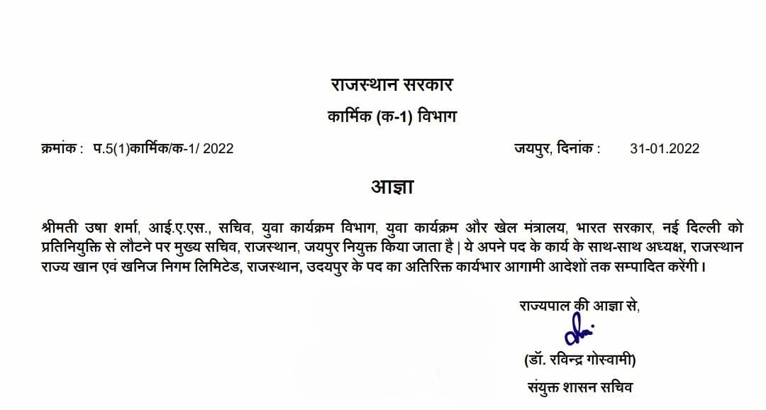 जयपुर: राजस्थान सरकार ने आज एक आदेश जारी कर वरिष्ठ आईएएस अधिकारी श्रीमती उषा शर्मा को भारत सरकार से प्रतिनियुक्ति से लौटने पर राजस्थान का मुख्य सचिव नियुक्त किया है। श्रीमती शर्मा वर्तमान में केंद्र सरकार में युवा कार्यक्रम विभाग और खेल मंत्रालय की सचिव हैं।