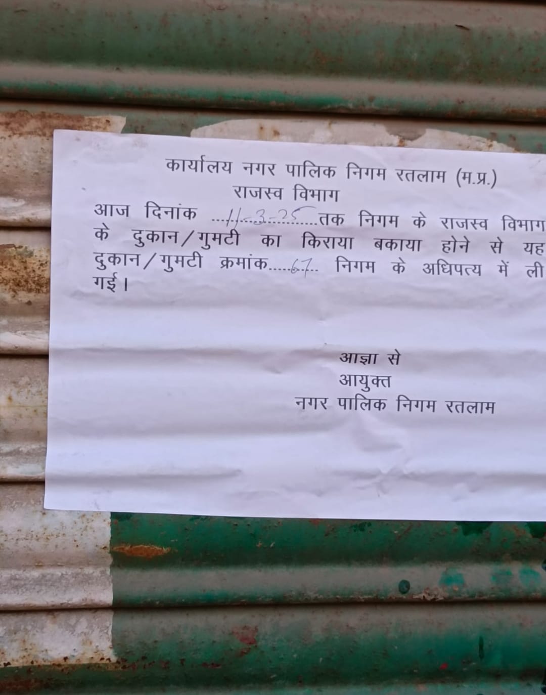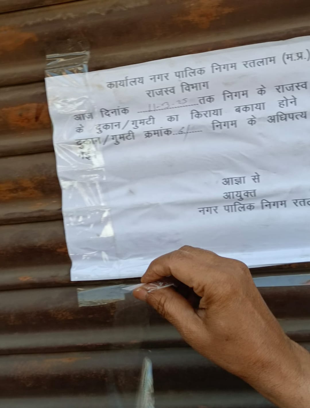 Ratlam : नगर निगम से संबंधित करो की शत-प्रतिशत वसूल किए जाने के निगम आयुक्त हिमांशु भट्ट द्वारा दिए गए निर्देशों के तहत नगर निगम के राजस्व अमले ने कार्यवाहीं करते हुए बकाया राशि जमा नहीं कराने पर 3 दुकानें एवं 2 गुमटी को सील किया। वहीं 3,02,061/- की राशि दुकान-गुमटी किराया बकाया के रूप में वसूल की।