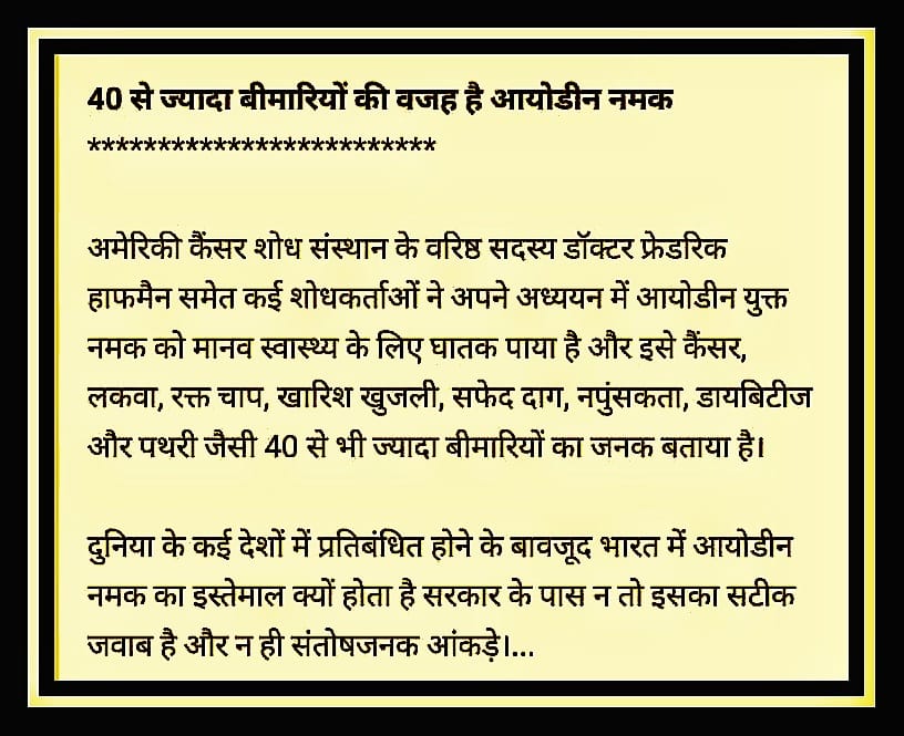 पिछले 40 साल से कथित घेंघारोग से बचाने के लिए 2 रुपए किलो वाले समुद्र लवण की जगह,20 रुपए किलो वाला आयोडीन नमक खिलाया जा रहा है। राजीव दीक्षित ने देश-समय काल में विचारे जा सकने वाले सभी विषयों पर कुछ कुछ कहा एकमात्र आयोडीन नमक को छोड़कर जबकि यह एक सबसे बड़ा सुनियोजित मेडिकल घोटाला है जिसमें थॉयराइंड , B.P., स्त्री-पुरुष बंध्यत्व, गर्भाशय गठान, प्रॉस्टेट सूजन, किडनी फेल्योर, मधुमेह, शिशु डायबिटीज़ जैसी बीमारियां खुद का पैसा खर्च करके खरीदी जाती हैं, क्योंकि 40 साल पहले जब आयोडीन नमक नहीं था तब इनबीमारियों का नाम भी किसी को पता नहीं था। समुद्र लवण सोडियम क्लोराइड Nacl में कुछ अंश में मैगनीशियम क्लोराइड Mgcl2 उपस्थित रहता है।जो वायु में उपस्थित नमी को सोख लेता है और नमी में सोडियम क्लोराइड घुलकर नमक में चिपचिपापन उत्पन्न करता है। जो कि इस बात का सबूत है कि नमक में सूक्ष्म पोषक तत्व मैगनीशियम उपस्थित है। मैग्नीशियम का संचार Animal Kingdom से Plant kingdom की तरफ होता है और प्रकाश संश्लेषण photosynthesis को उत्प्रेरित करता है जो हरियाली में उपलब्ध क्लोरोफिल का जरूरी तत्व है।आयोडीन नमक में सोडियम क्लोराइड के साथ आयोडीन कम्पाउंड के रूप में पोटेशियम आयोडेट KI03 मिला होता है और उपभोक्ता की अनुमति लिए बिना उसे फ्री-फ्लो बनाने के उपक्रम में Mgcl2 मैग्नीशियम क्लोराइड को अलग करके Anti caking एजेंट के रूप में E-536 आदि केमिकल मिलाते हैं। जबकि शरीर में इनकी food Value अथवा Medicinal Value की कोई स्टडी उपलब्ध नहीं है।