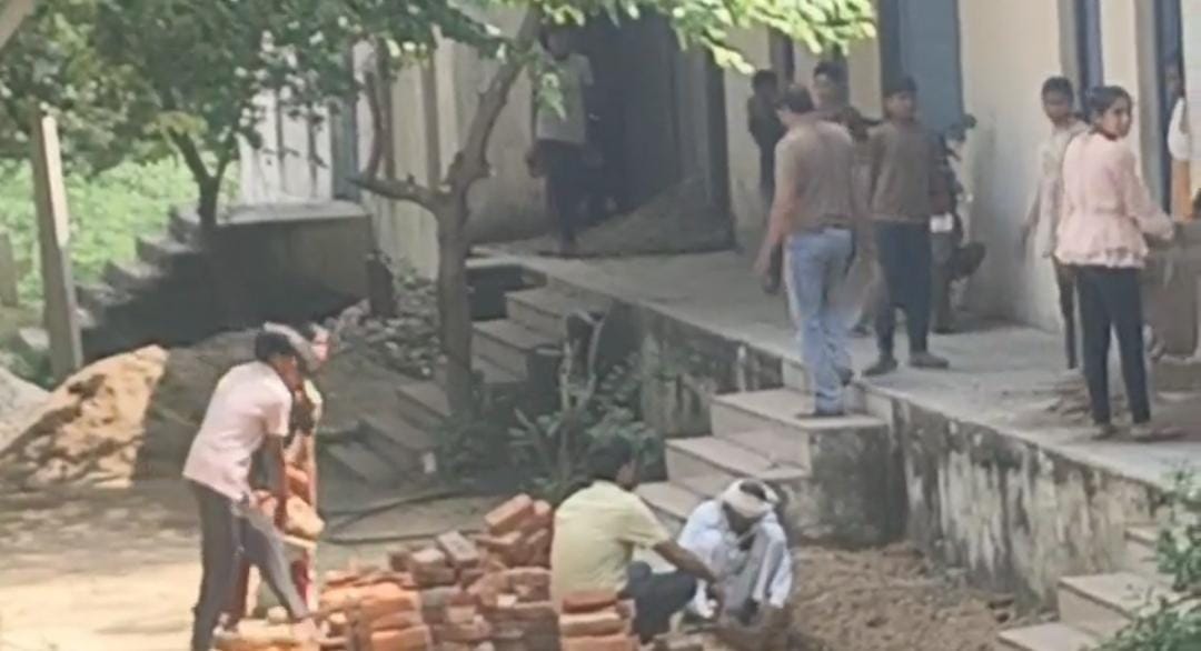 वीडियो में दो छात्र तसले में रखकर ईंटें ढोते दिख रहे हैं। वहीं, कुछ छात्राएं बिल्डिंग के चबूतरे पर खड़े होकर छन्ने से रेत छानती दिख रही हैं।एक पुरुष और एक महिला टीचर भी स्कूली बच्चों के साथ काम करते नजर आ रहे हैं।एक मिस्री भी नीचे बैठकर काम कर रहा है।