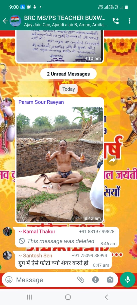 मामला छतरपुर जिले के बकस्वाहा का है जहां बकस्वाहा ब्लॉक अंर्तगत आने वाले प्राथमिक शाला रैयन में पदस्थ शिक्षक परम लाल सौर ने नशे की हालात में दोनो हाथो में शराब की बोतल लेकर फोटो ब्लॉक शिक्षा आधिकारी एवं अन्य शासकीय ग्रुपों में डाल दी, जिससे ग्रुप में हड़कंप मच गया। नतीजतन जिसके बाद उनके खिलाफ ब्लॉक शिक्षा अधिकारी पवन राय ने प्रतिवेदन बना कर जिला आधिकारी एम के कोटार्य को भेजा जिस पर उन्होंने ने शिक्षक को निलंबित कर दिया