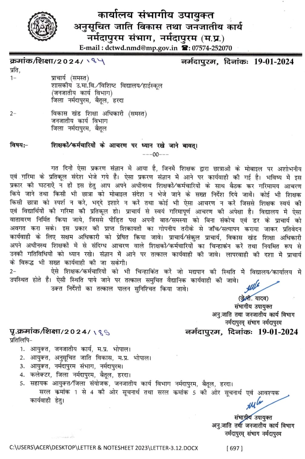 जिसमें शिक्षक द्वारा की गई हरकत का सही होना पाया गया। तब शिक्षक का तबादला दूसरी जगह कर दिया गया। उपायुक्त जे पी यादव ने मीडियावाला को बताया कि शिक्षक की यह हरकत शर्मनाक है। मामले की पुष्टि होते ही हमने पहले तो उसे तत्काल वहां से हटाकर दूसरी जगह भेजा और फिर उसके निलंबन का प्रस्ताव बनाकर आयुक्त को कल गुरुवार को भेज दिया। आज शुक्रवार को उसे सस्पेंड भी कर किया गया। छात्रा नाबालिग है, इसलिए शिक्षक के खिलाफ आपराधिक प्रकरण स्कूल प्राचार्य या उसके माता-पिता को कराना चाहिए। मैने गुरुवार को ही सहायक आयुक्त की इस लापरवाही के साथ ही अन्य कार्यों में भी उनकी उदासीनता की कार्यशैली पर भी एक रिपोर्ट विभाग के उच्च स्तर पर और कलेक्टर नर्मदापुरम को भेज दी थी। वहीं कलेक्टर सोनिया मीना ने बताया कि सहायक आयुक्त जनजाति कार्य विभाग द्वारा उक्त प्रकरण में रिपोर्ट देने पर देरी की गई।
