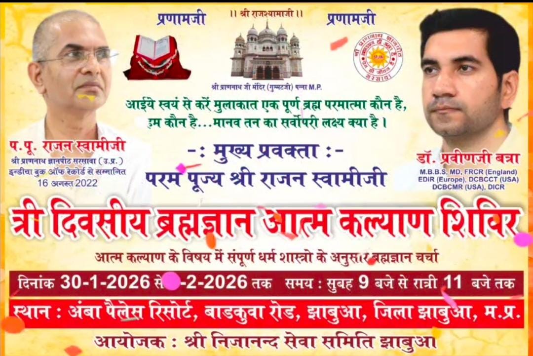 JHABUA: मध्य प्रदेश के पश्चिम सीमांत जनजातीय बहुल झाबुआ जिला मुख्यालय पर 30 जनवरी 2026 से 2 फरवरी 2026 तक अम्बर पैलेस रिसोर्ट, बाडकुवा रोड झाबुआ में त्रि-दिवसीय ब्रह्मज्ञान आत्म-कल्याण शिविर का आयोजन किया जा रहा है। यह शिविर आत्मिक कल्याण और ब्रह्मज्ञान के विषय पर शिक्षण, ध्यान, प्रश्न-उत्तर सत्र और धर्म-शास्त्र के अनुरूप प्रवचन के लिए समर्पित है।