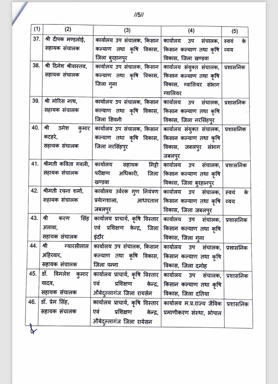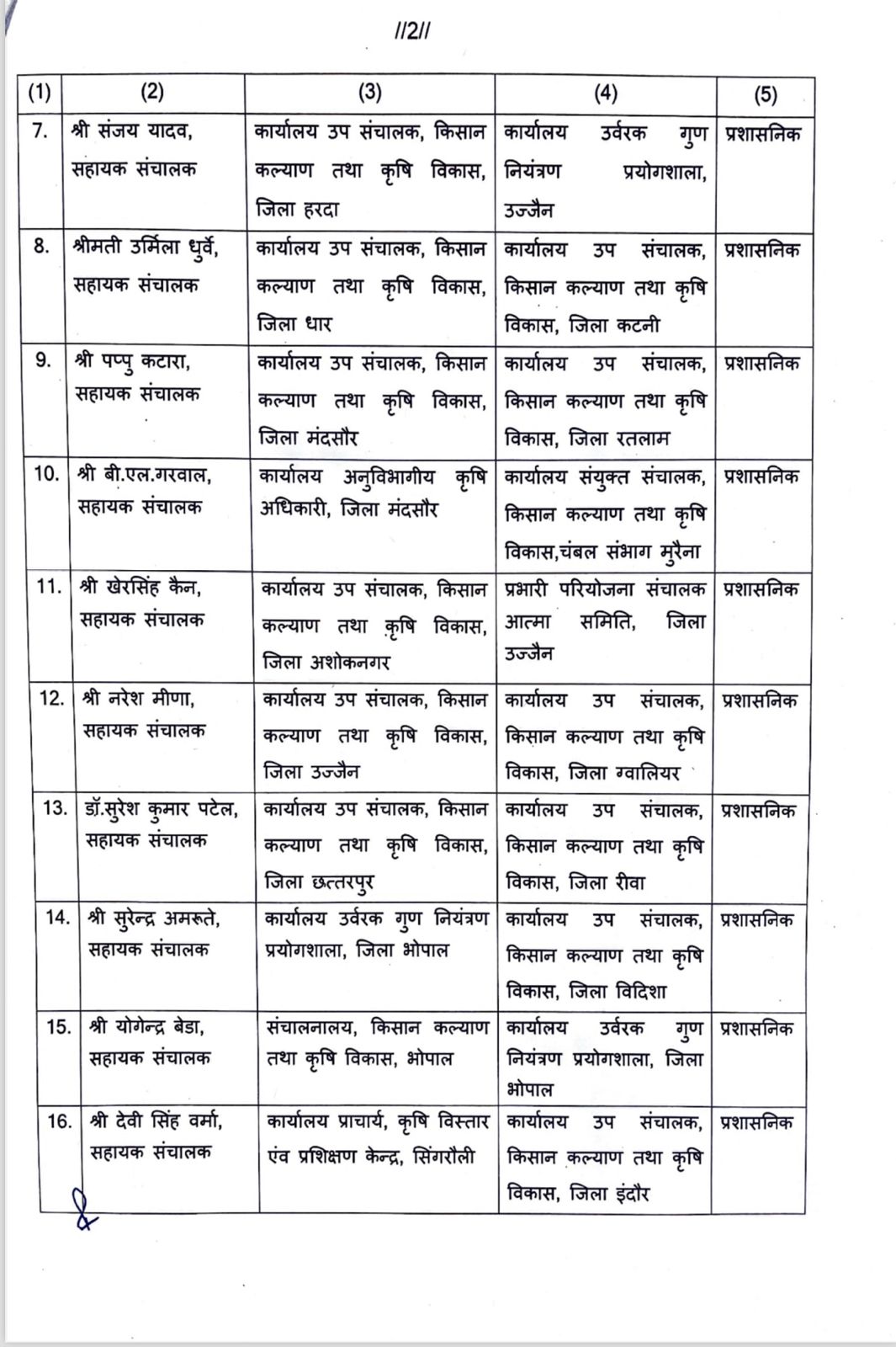 भोपाल: राज्य शासन किसान कल्याण तथा कृषि विकास विभाग द्वारा आज प्रदेश के विभिन्न स्थानों पर पदस्थ 48 सहायक संचालक संवर्ग के अधिकारियों के तबादला आदेश जारी किए गए हैं।