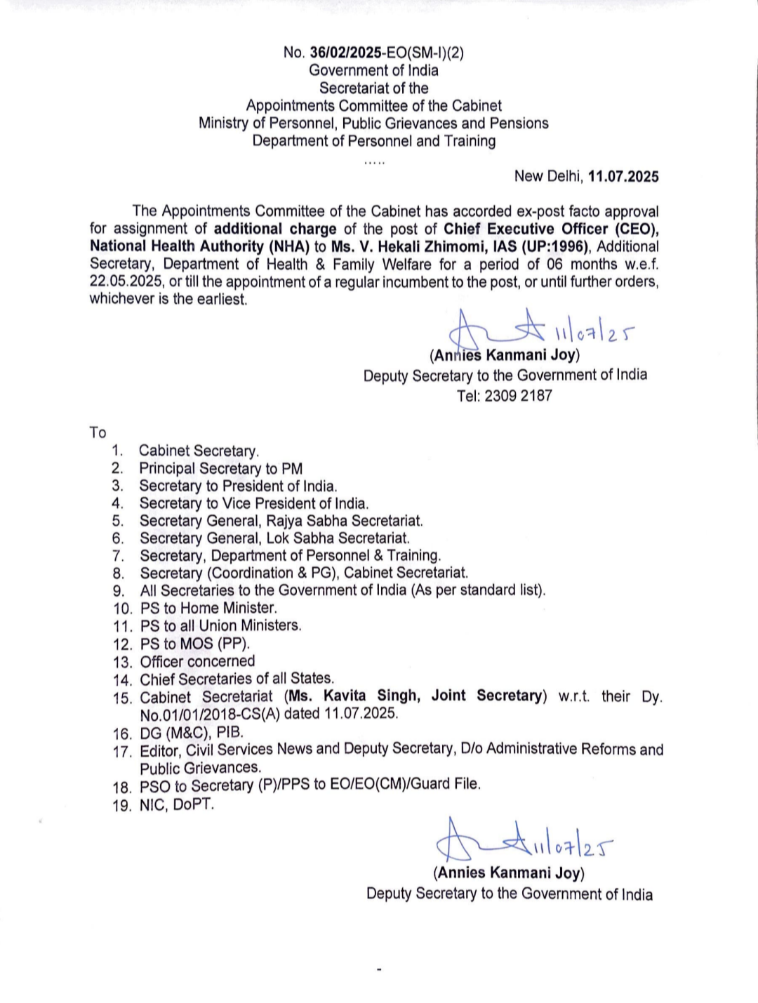 कार्मिक एवं प्रशिक्षण विभाग (DoPT) द्वारा जारी आदेश के अनुसार, मंत्रिमंडल की नियुक्ति समिति ने 22 मई, 2025 से छह महीने के लिए या नियमित नियुक्ति होने तक या अगले आदेश तक – जो भी पहले हो, झिमोमी को अतिरिक्त प्रभार सौंपने को मंजूरी दे दी है।