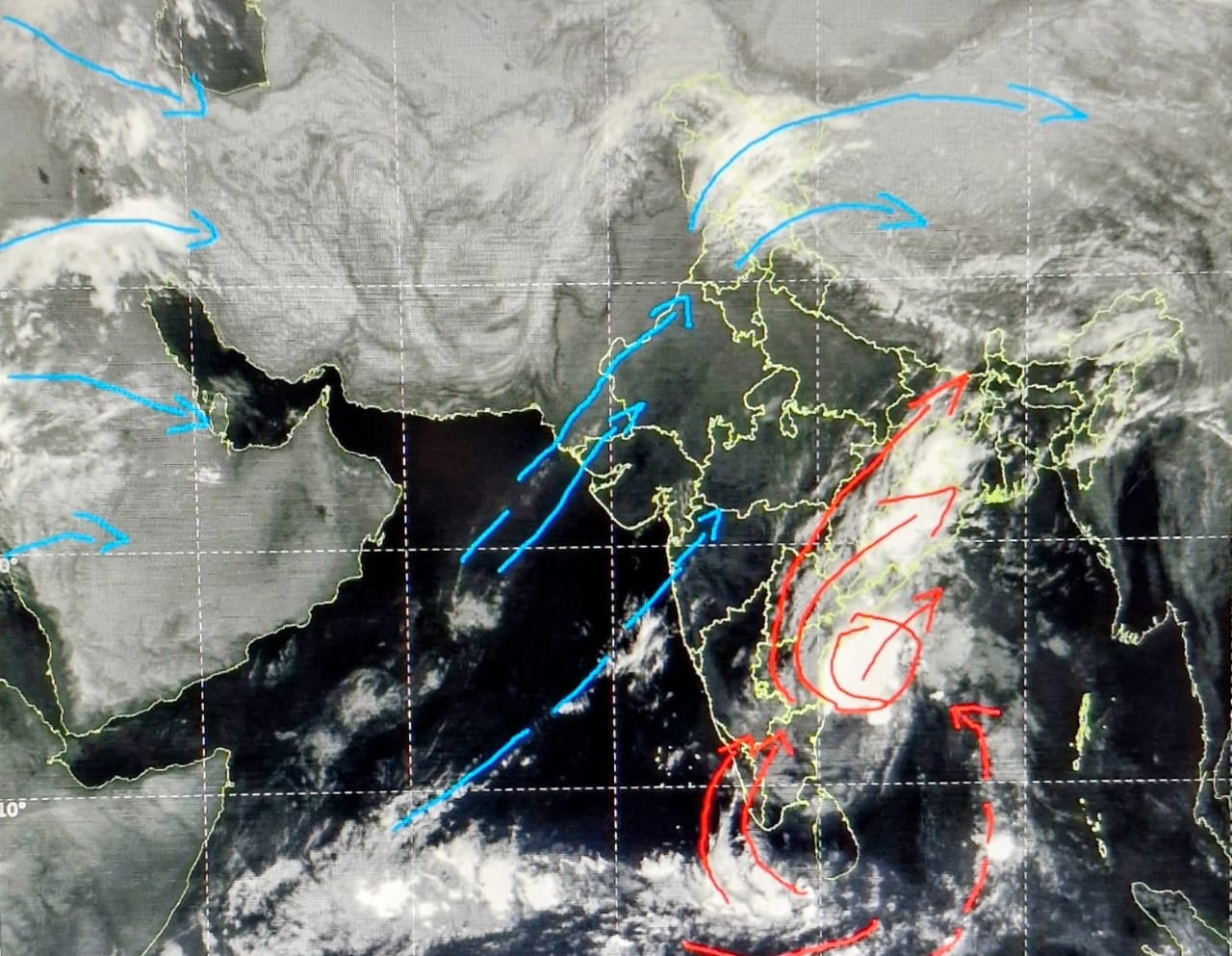 दक्षिण -पश्चिम बादलों की लहर कर्नाटक, महाराष्ट्र और पूर्वी मध्य प्रदेश से गुजर रही है। पश्चिमी हवाओं के प्रहार से दक्षिणी हवाएं उत्तर -पूर्व की ओर जाने को लाचार हो रहीं हैं। जबकि उत्तर भारत में पश्चिमी हवाओं के असर से कश्मीर, पंजाब, हिमाचल से बादल लद्दाख से गुजर रहे हैं। लद्दाख और हिमाचल के पहाड़ों पर बर्फ गिर सकती है।