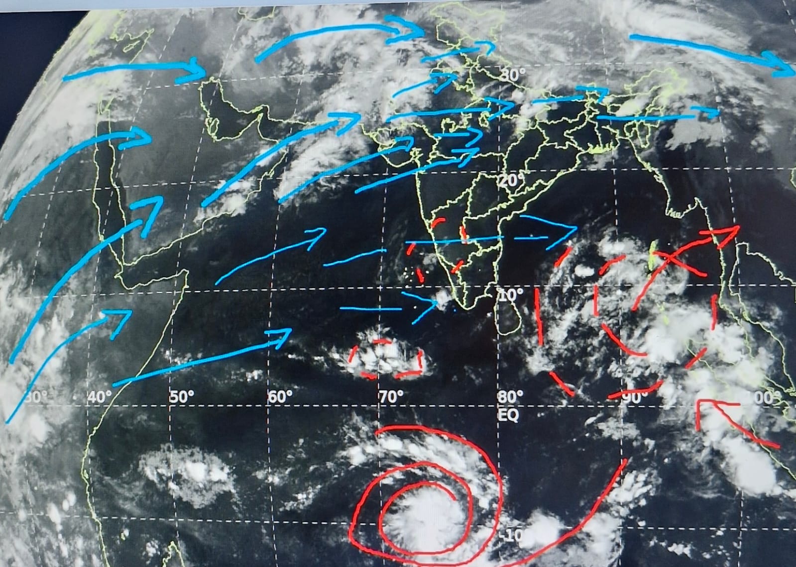 पश्चिमी हवाओं के दबाव से बंगाल की खाड़ी के बादल पूर्वी हवाओं से टकराकर चक्राकार हो रहे हैं। दक्षिण महासागर में नया चक्रवात आज से 35 km प्रति घंटे की रफ्तार में आ गया है। बावजूद अभी इसकी दिशा तय नहीं है।
