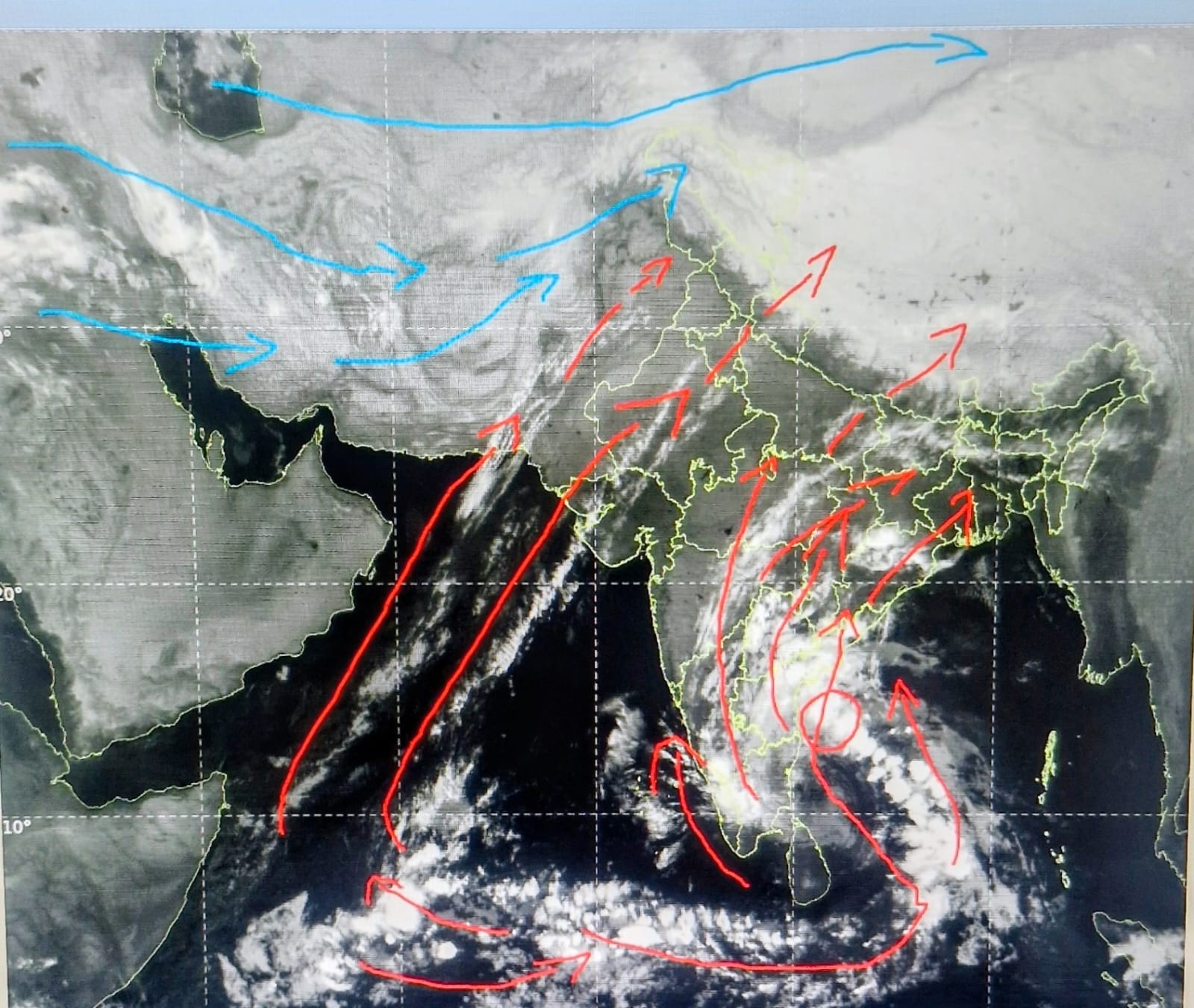 भारत के दक्षिण और पूर्व समुद्रीय इलाकों में फिर से तीन चक्रवात सक्रिय हैं। इसमें श्रीलंका से निकला चक्रवाती तूफान दित्वाह 55 km की रफ़्तार से चेन्नई पहुंच रहा है। आज रात यह समाप्त हो जाएगा लेकिन इसके असर से तमिलनाडु, केरल, आंध्रा, कर्नाटक, तेलंगाना में बारिश की स्थिति है, जबकि बादलों का फैलाव पूर्वी महाराष्ट्र, उड़ीसा, छत्तीसगढ़ तक है। असर पश्चिम में भी है जहां दक्षिण की हवाएं बादलों को गुजरात, राजस्थान, मध्यप्रदेश, हरियाणा, उत्तराखंड तक बहा रहीं हैं। उधर पश्चिमी हवाओं से ठंड की मार पंजाब, हरियाणा, दिल्ली, यूपी सहित उत्तरी राज्यों में है।