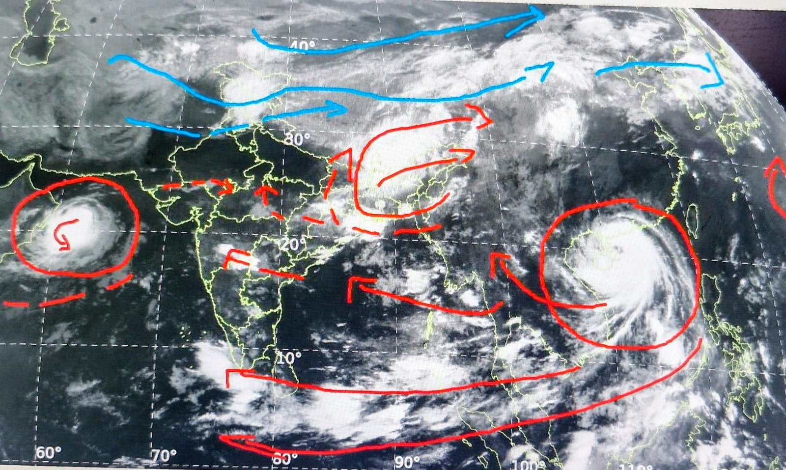 भारत की पूर्वी दिशा से आ रहा चक्रवात “मातमो” अभी 150 km की गति से आज रात को चीन के झांझिआंग में प्रवेश करेगा। यहां से कल 150 km की गति में बदलेगा और 7 अक्टूबर को चीन के ही यून्नन (म्यांमार के पास) में आकर समाप्त होगा। इसके प्रभाव से भारत के उत्तर – पूर्वी राज्यों में बारिश होगी।