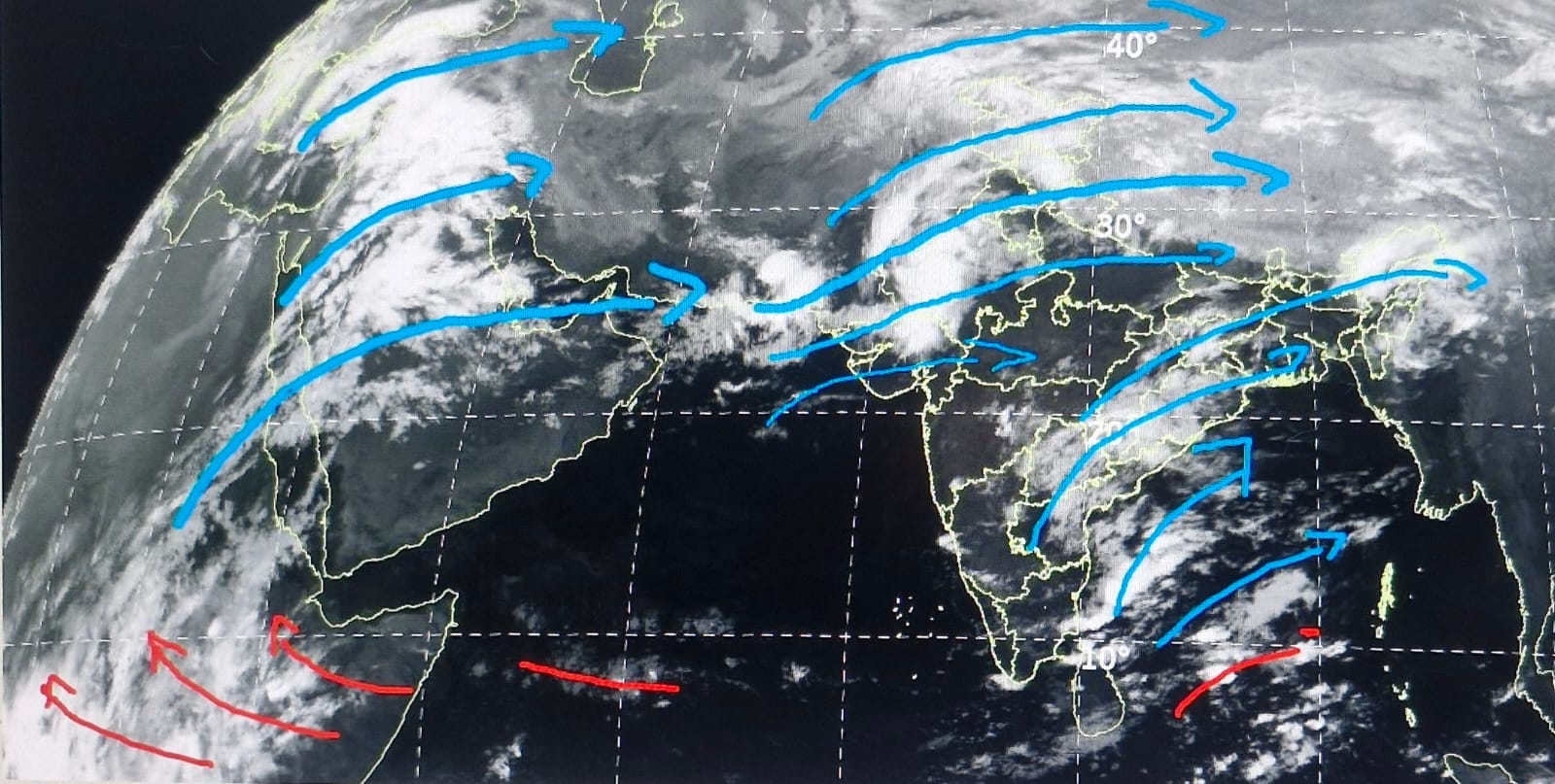 पश्चिमी बादलों का जाल गुजरात के उत्तरी भाग से लेकर महाराष्ट्र, कर्नाटक, तेलंगाना, आंध्रा, उड़ीसा, छग, एमपी, झारखंड से लेकर उत्तर – पूर्वी राज्यों तक फैला हुआ है।