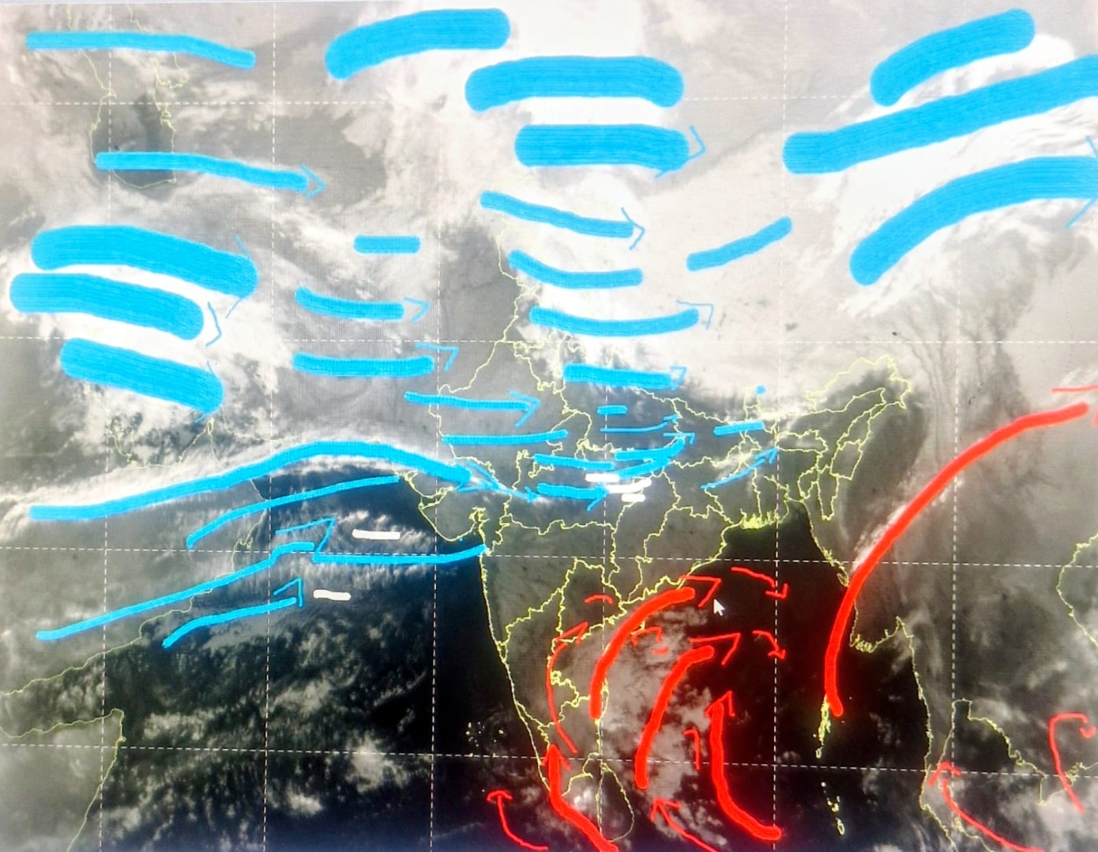 दक्षिण भारत में हवाओं का रुख पूर्व से उत्तर पश्चिम की ओर होने से बंगाल की खाड़ी से बादल तमिलनाडु, आंध्रा तक घुस आए हैं। असर केरल और दक्षिण कर्नाटक तक है। लेकिन इन राज्यों में बादल पश्चिमी हवाओं से चक्राकार हो रहे हैं। आज और कल तमिलनाडु और आंध्रा में बारिश हो सकती है। केरल में कल परसों में बारिश होगी।