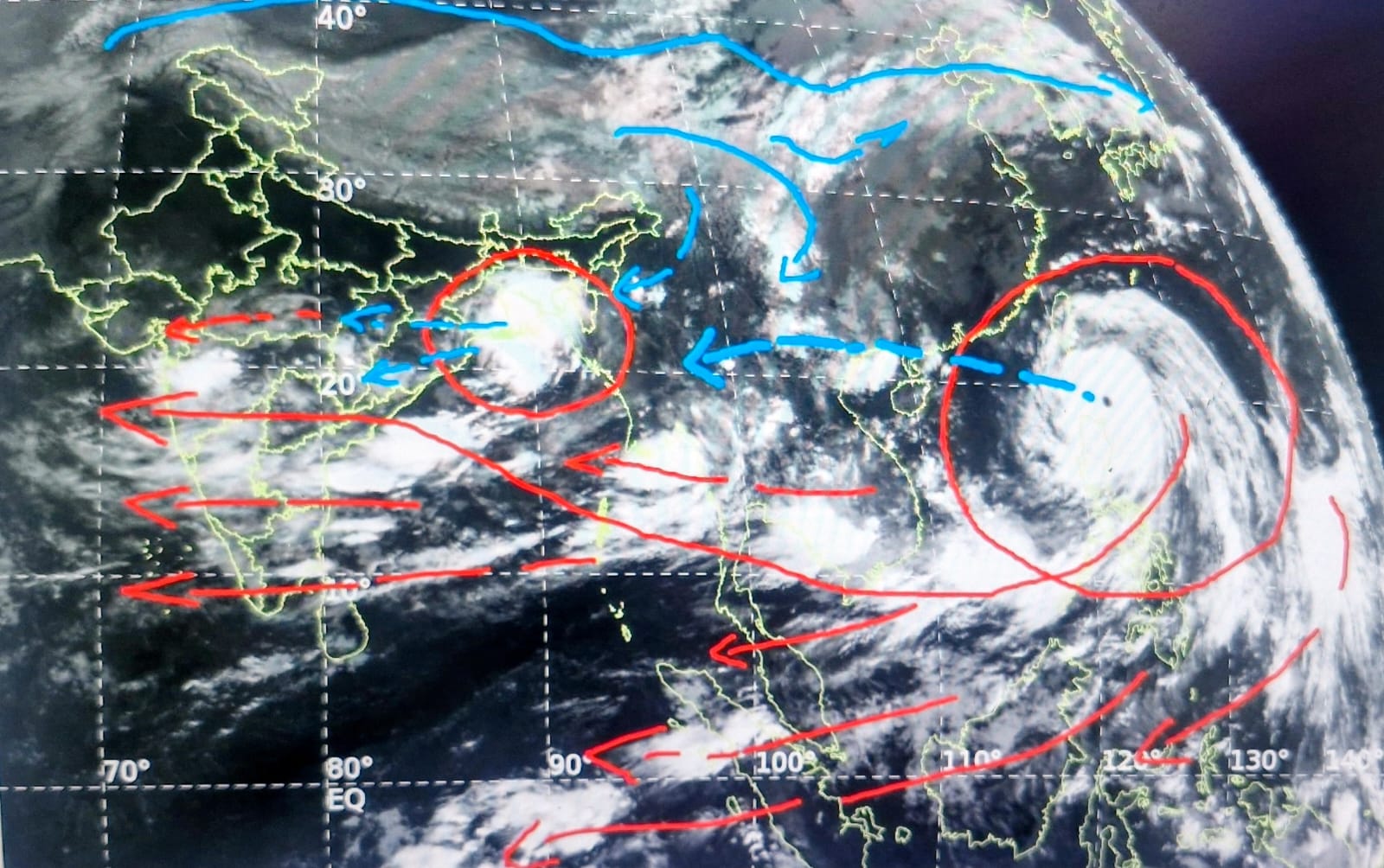 इधर भारत की पूर्वी दिशा में विशाल चक्रवात रगासा अब 270 किलोमीटर प्रति घंटे की रफ्तार से चीन की ओर आगे बढ़ रहा है। सिर्फ चीन ही नहीं, यह फिलिपींस सहित कई देशों में भी तबाही फैला रहा है। अगले तीन दिनों तक यह बेहद प्रभावी रहेगा और भारत के नजदीक आते-आते बंगाल की खाड़ी में बादलों का भारी जमाव होगा। शुक्रवार तक इसका अंत होने की संभावना है लेकिन तब तक भारत के दक्षिण पश्चिम भाग में बारिश की संभावना अक्टूबर के पहले सप्ताह तक बनी रहेगी।