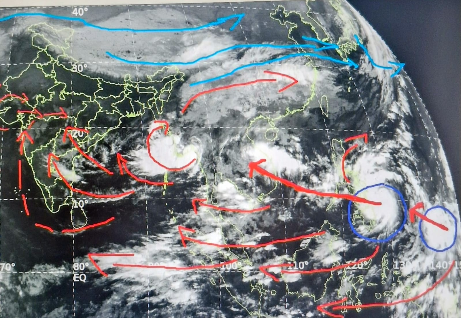 पूर्वी दिशा के दो चक्रवात भारत का मौसम बिगाड़ेंगे। इसमें आज फिलीपींस में हंगामा मचाने वाला चक्रवात कलमाएगी (टीनो) आज रात तक 155 km प्रति घंटे की रफ्तार में आ जाएगा। अब यह 7 नवम्बर को वियतनाम से आगे लोस तक जाएगा। इससे भारत के उत्तर पूर्वी और दक्षिण राज्यों में और बंगाल की खाड़ी में बारिश का सिलसिला चलेगा।