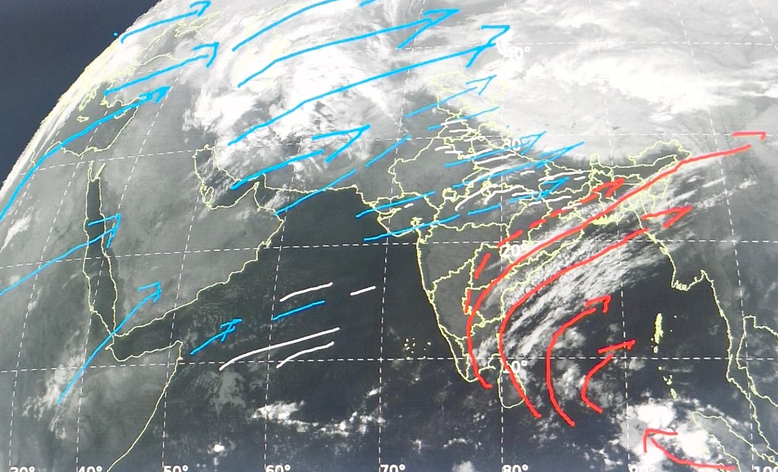 दक्षिणी राज्यों में बादल दक्षिण महासागर से उत्तर पूर्व की ओर चल रहे हैं केरल, तामिलनाडू, आंध्रा, दक्षिण छग, उड़ीसा से बंगाल होते हुए बादलों की लहर गुज़र रही है जिससे तापमान में वृद्धि हो रही है।