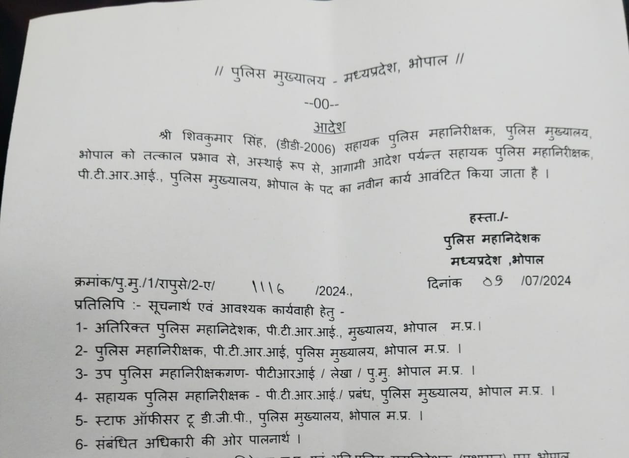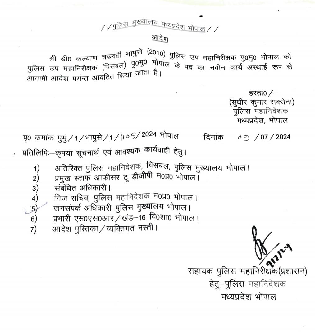 भोपाल: पुलिस महानिदेशक (DGP) सुधीर कुमार सक्सेना ने पुलिस मुख्यालय में स्थानांतरित होकर आए 4 IPS अधिकारियों और राज्य पुलिस सेवा के एक अधिकारी को कार्य आवंटित कर दिए हैं। ये आईपीएस अधिकारी हैं : कल्याण चक्रवर्ती, मोनिका शुक्ला, विजय भगवानी और राकेश कुमार सिंह।